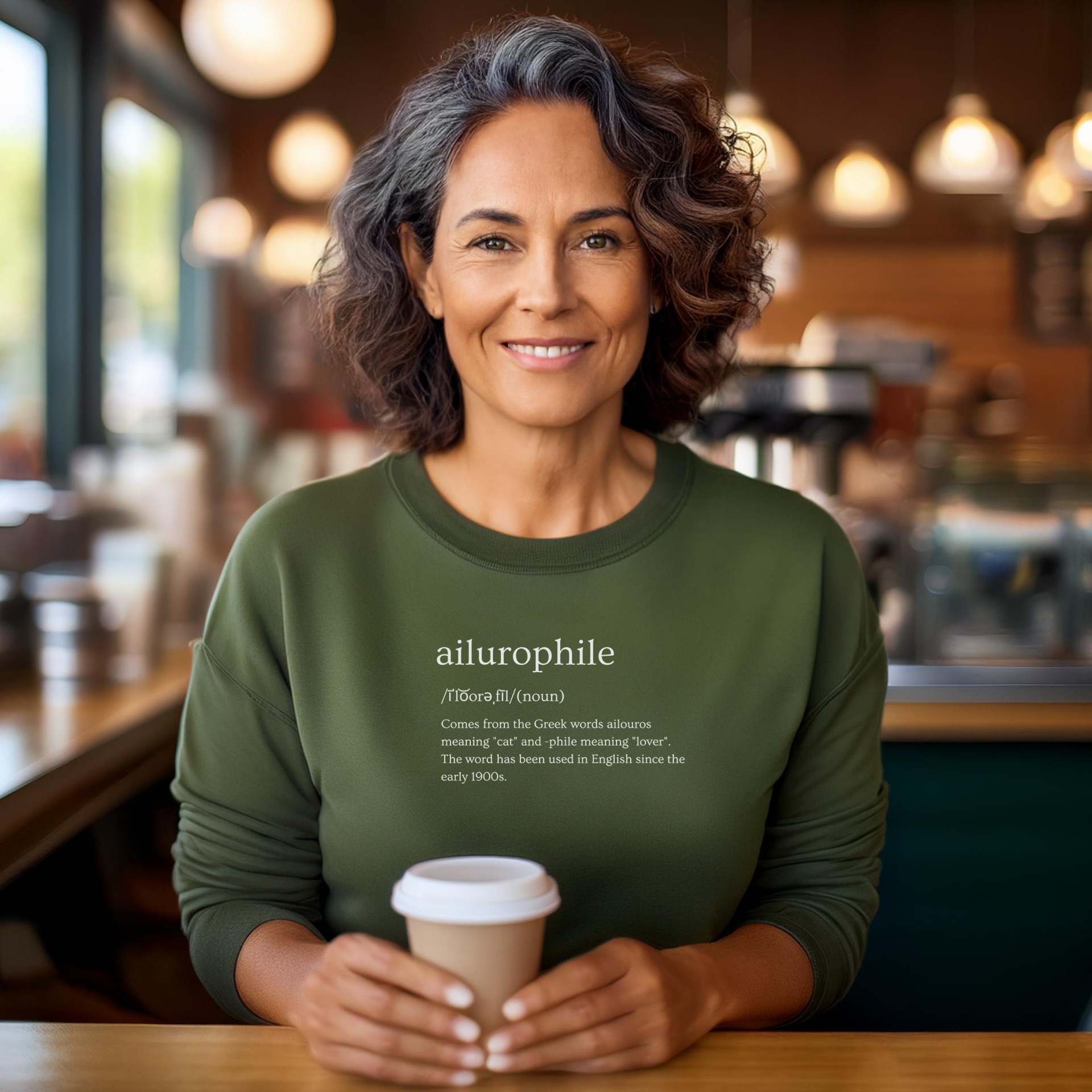 Show your love for felines with our Ailurophile Definition Sweatshirt! Made from a soft blend of 50% cotton and 50% polyester, this classic unisex crewneck is not just a fashion statement but a badge of honor for all cat lovers. Perfect for lounging at home, casual outings, or as a thoughtful gift for the cat enthusiast in your life. With features like double-needle stitching and a comfortable fit, this sweatshirt is designed for enhanced durability and style. Grab yours today and wear your passion proudly! Makes a great gift for cat lovers, cataholics, cat devotees, cat fans, feline enthusiasts, kitty adorers...you get the idea!