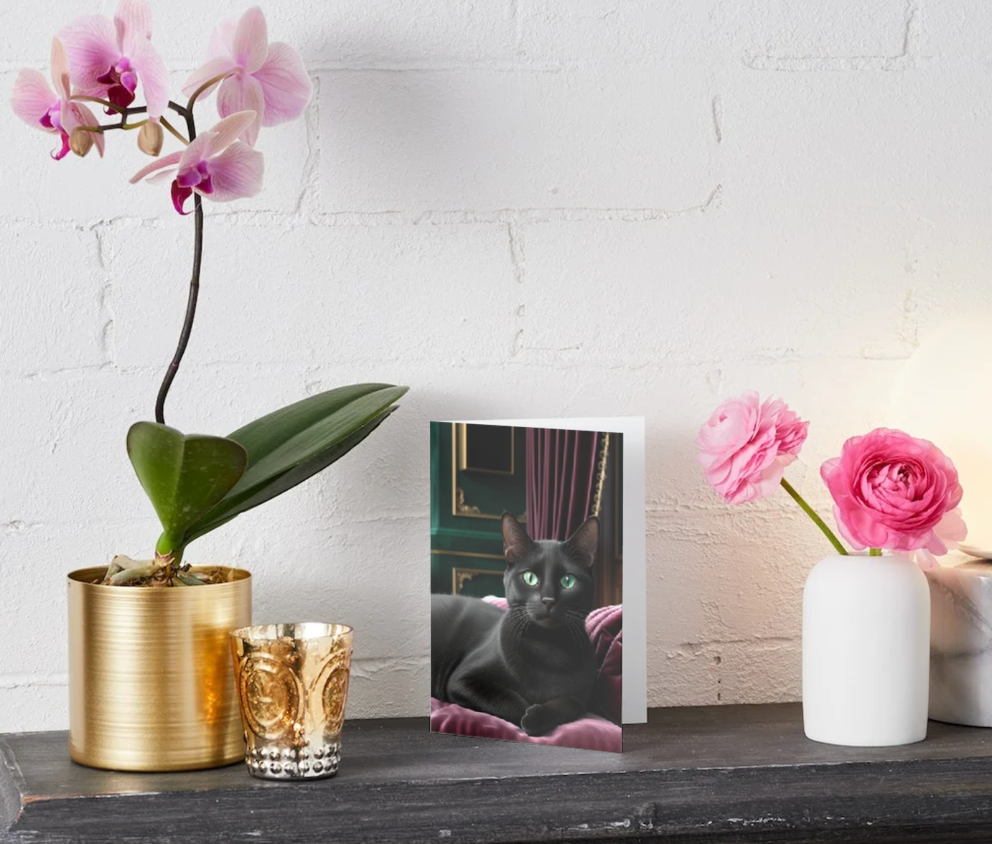 Express your sentiments with our exclusive pack of 10 folded greeting cards featuring an enchanting illustration of a black cat nestled in a lush dark home environment. These personalized cards are perfect for any occasion, whether it's a birthday, thank you, or just a note to a friend.