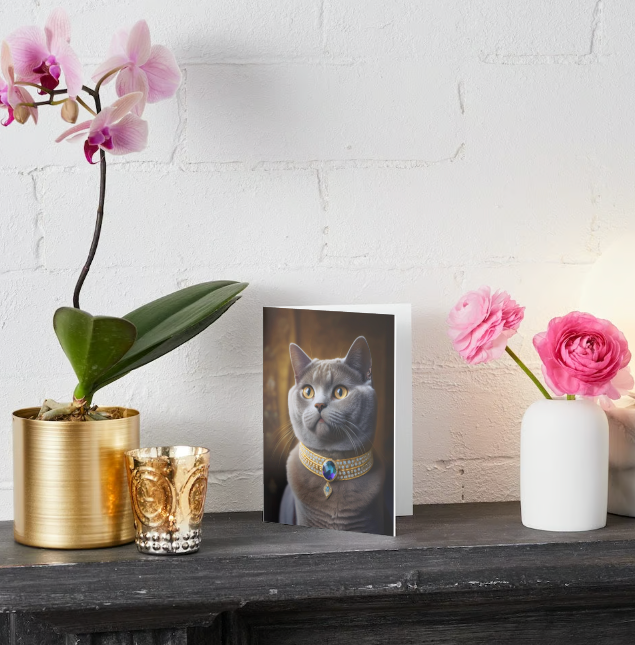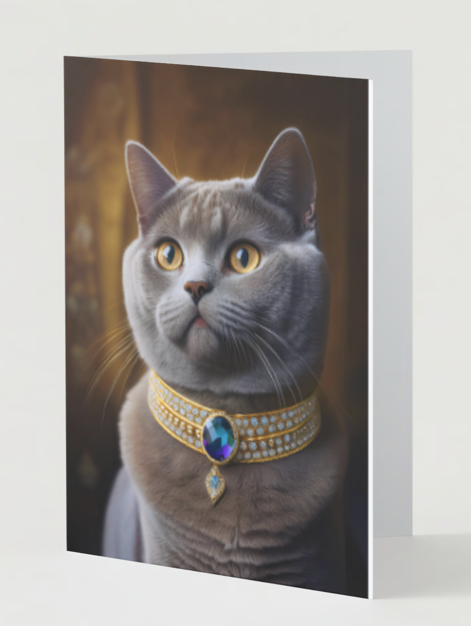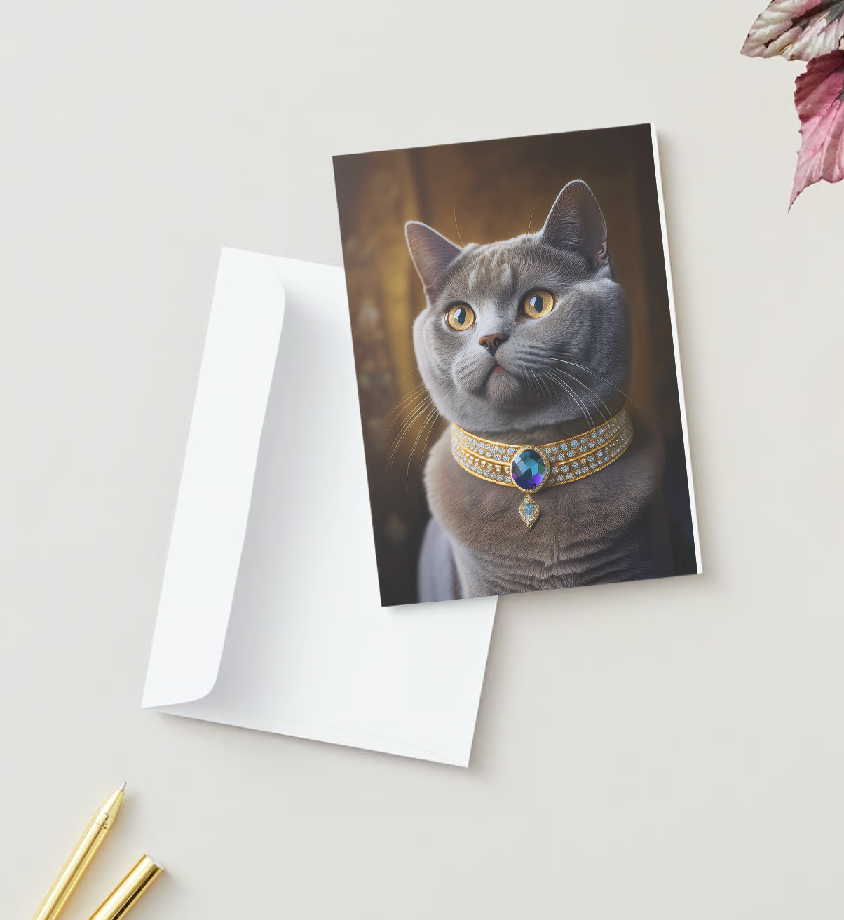 Spread some Baroque style holiday cheer with our delightful Christmas card featuring a handsome British Shorthair/Blue American Shorthair breed cat in a fancy collar, ready to add warmth and whimsy to your festive greetings! Stylish and unique. Designed by cat people for cat people! Interior reads "MERRY CHRISTMAS" and has some paw prints facing the text page. The interior also has space to write your own purr-fect personal holiday message. The cards measure 5x7 with a vertical fold.
