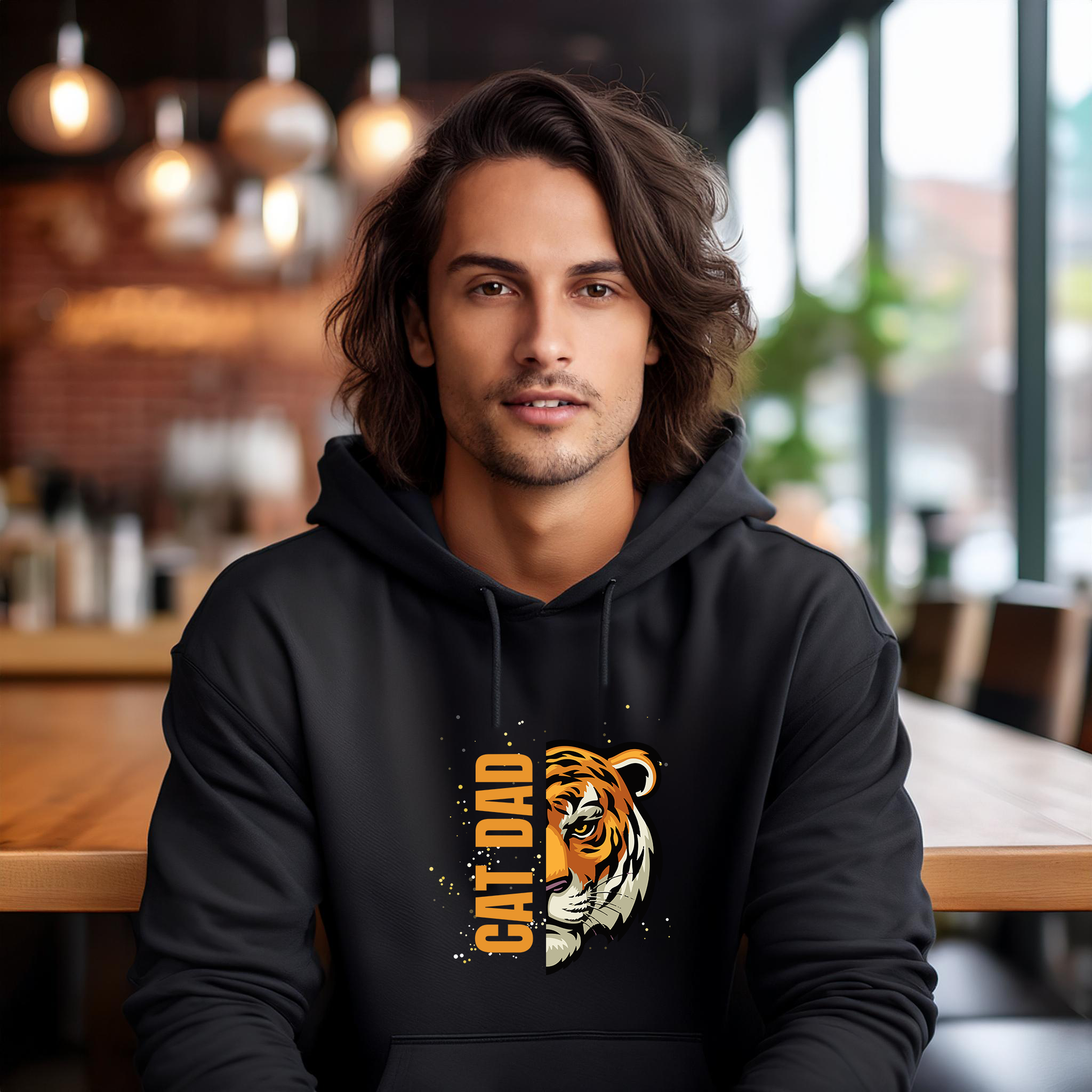 Showcase your love for felines with our Cat Dad Tiger Print Hoodie, designed for comfort and style.