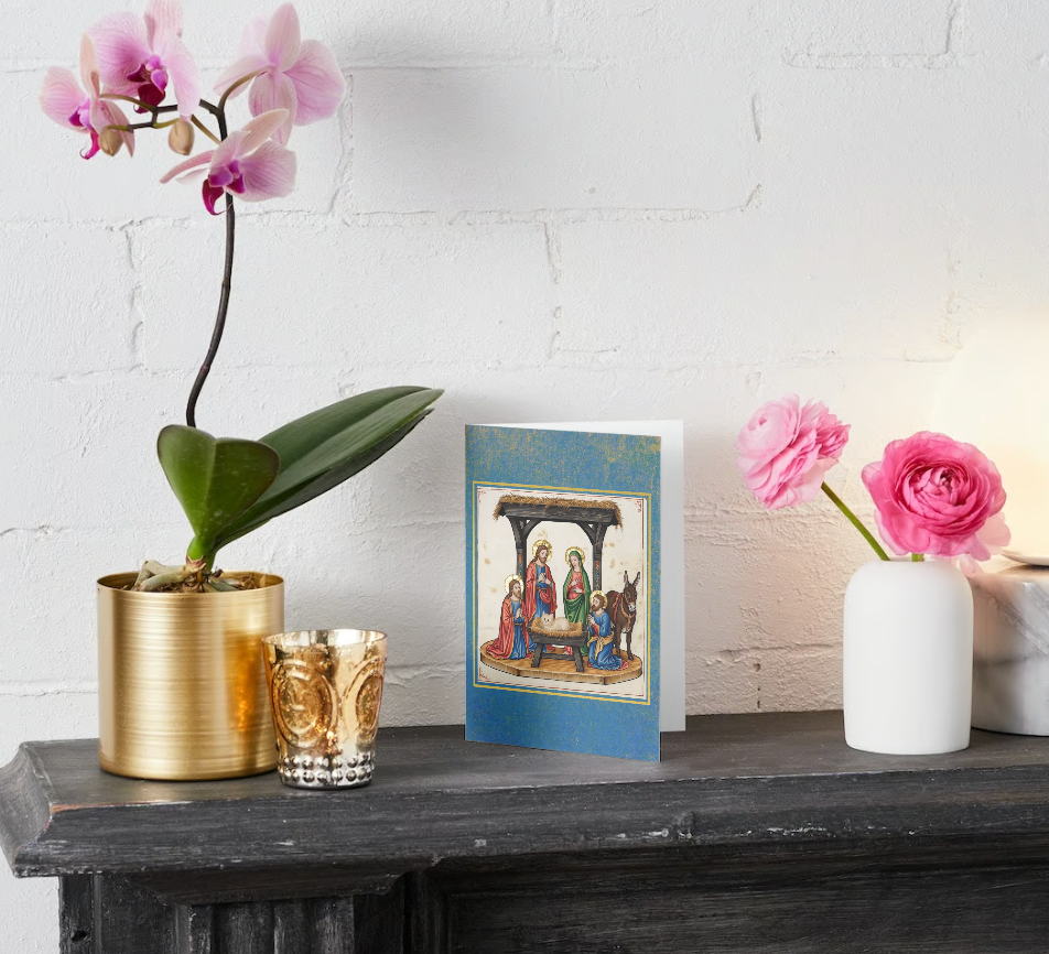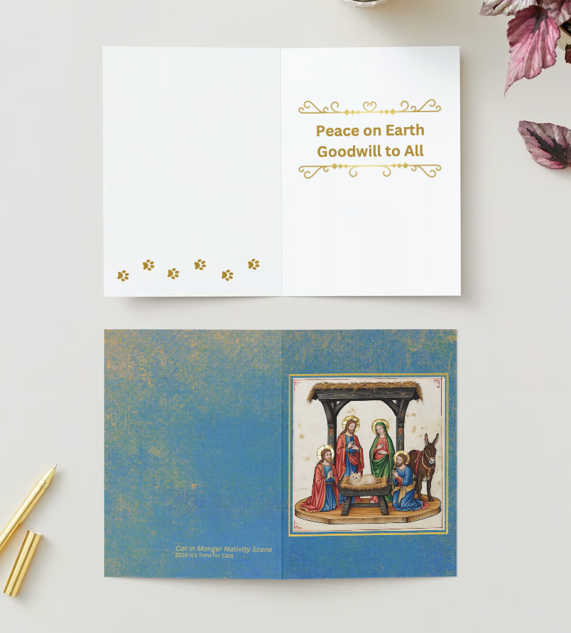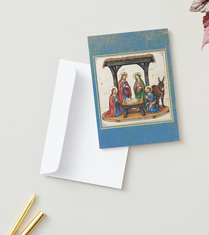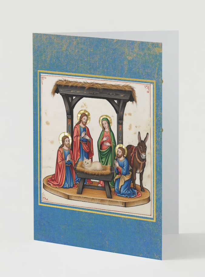 Celebrate the season with a twist! Our Cat in the Manger Christmas Card features a delightful rendition of the holy family, with our furry friend taking center stage in a charming manger. Set against a medium blue background flecked with gold, this card draws inspiration from beautiful medieval manuscript illuminations, making it a one-of-a-kind piece to share with loved ones. Perfect for sending warm holiday wishes, this card adds a quirky touch to your festive greetings. Order your pack today and spread the joy this Christmas!