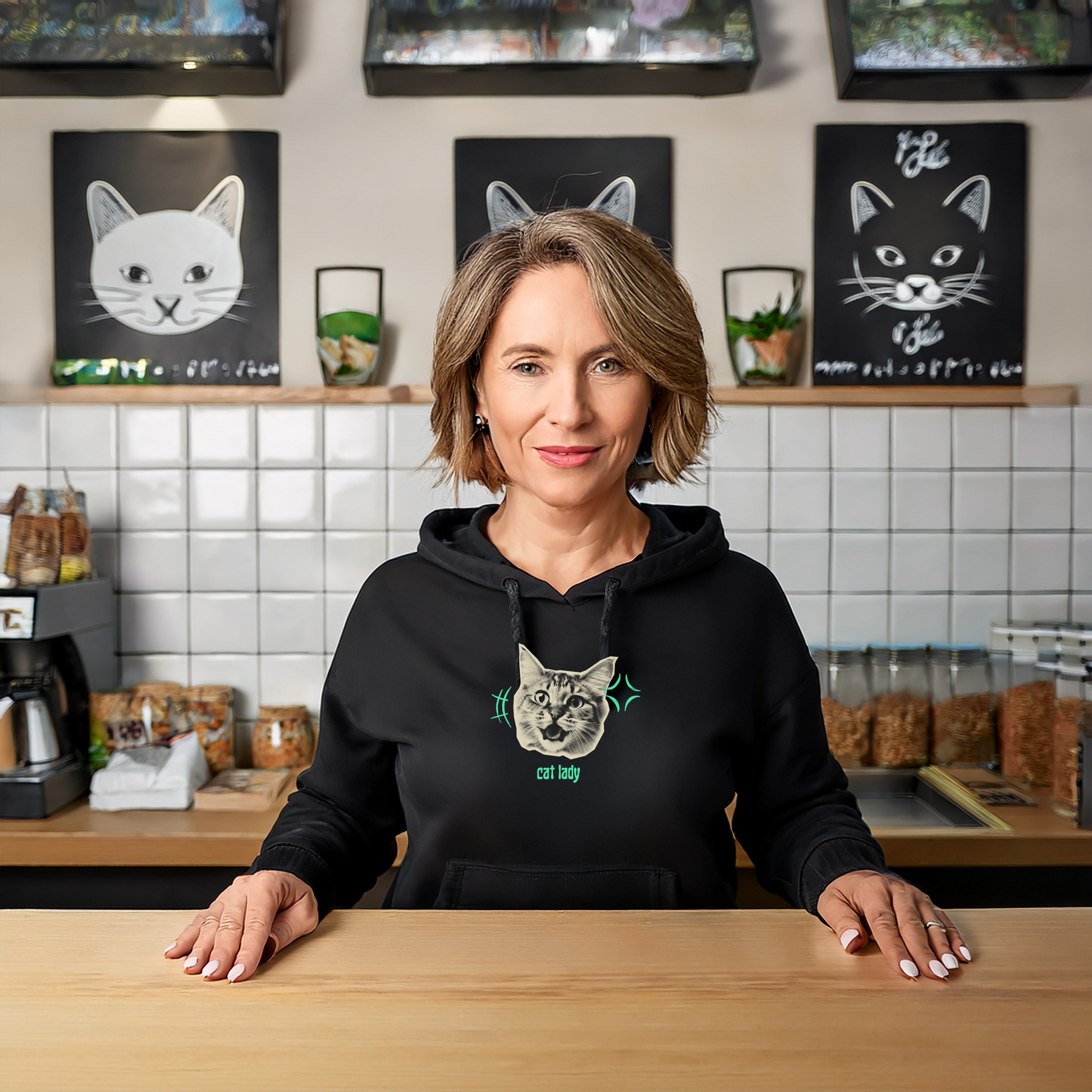 Cat Lady! Declaring it loud and clear. A large cat face with the "cat lady" text in bratty green color. Available in navy blue or black in unisex inclusive sizes. This unisex hoodie is a comfortable, true-to-size fit made from a soft blend of 50% cotton and 50% polyester. Size up for an oversized style. Eco-friendly dyeing process. A great gift for the cat owners.