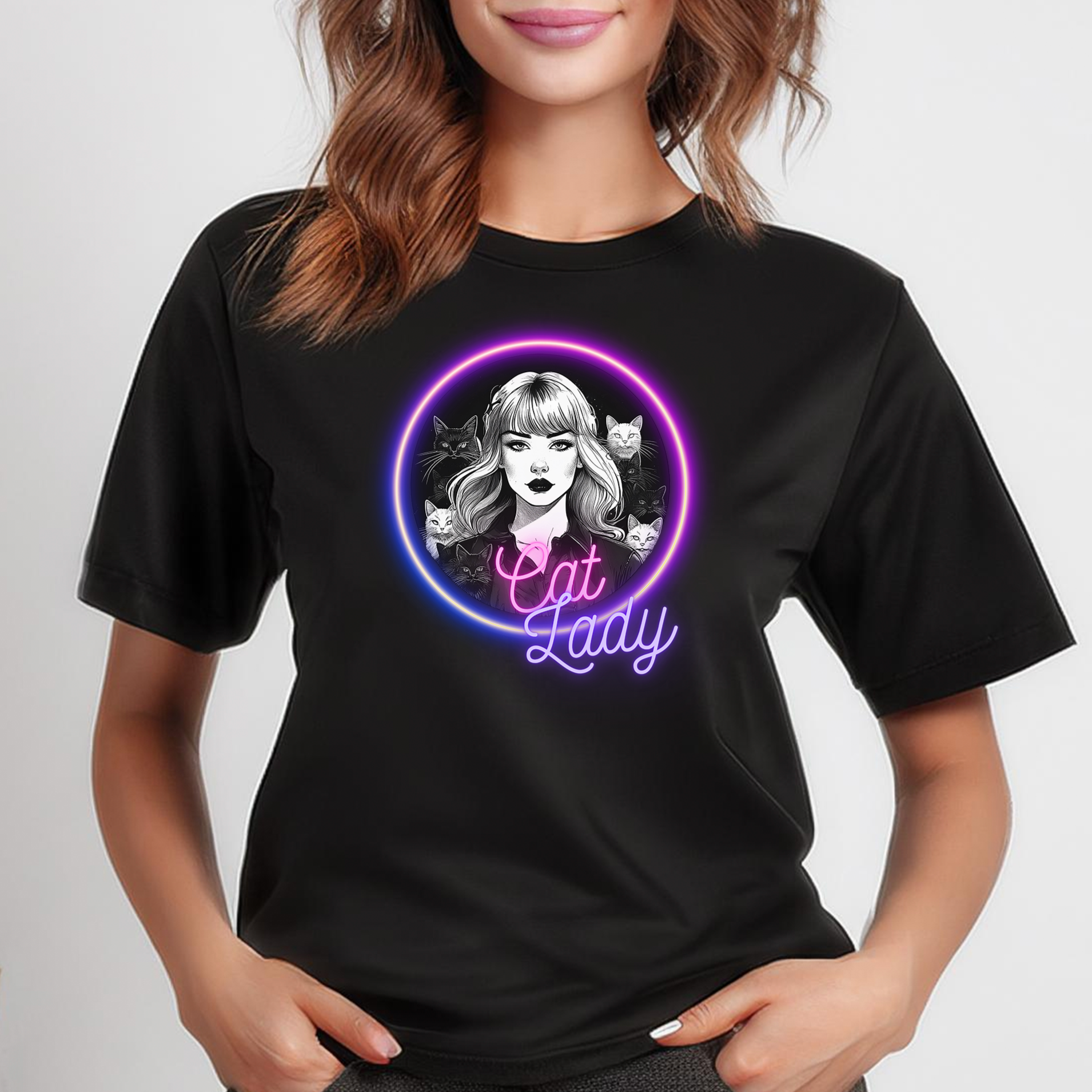 Surrounded by a clowder of cats and basking in a neon glow of pink and purple, this cat lady design is printed on a comfortable cropped and boxy fit t-shirt. Available in XS-2XL in white or black (to match your cat's fur.) A nice gift for the cat mom cat lady in your life with a love for felines.
