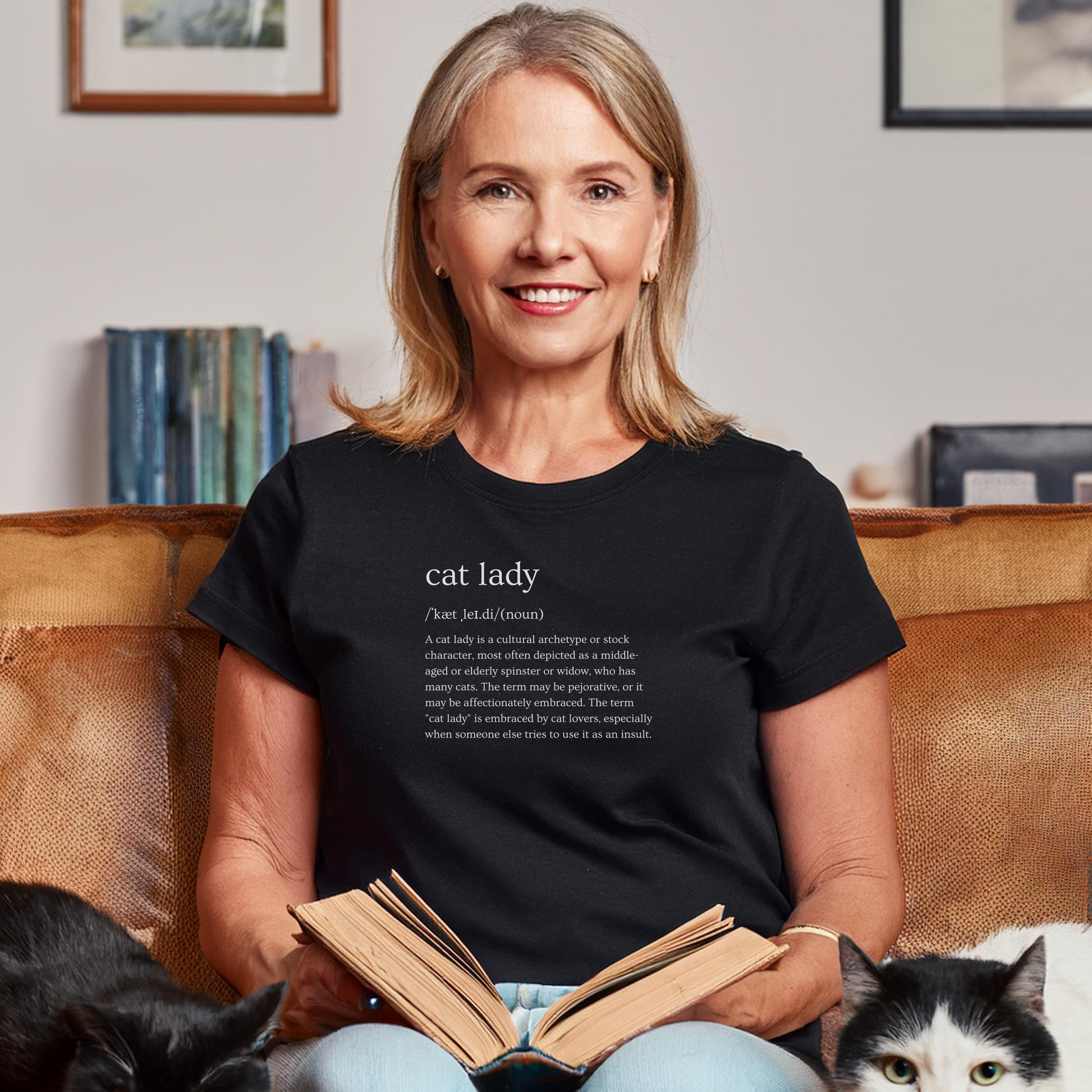 By definition, are you a cat lady who likes to make a feline fashion statement? This purrfect t-shirt is made of 100% comfy cotton, available in five colors and inclusive sizing. Celebrate your cat love with this stylish pet fashion tee. Comfortable, true-to-size fit. Size up for an oversized style. Eco-friendly dyeing process and materials are used.