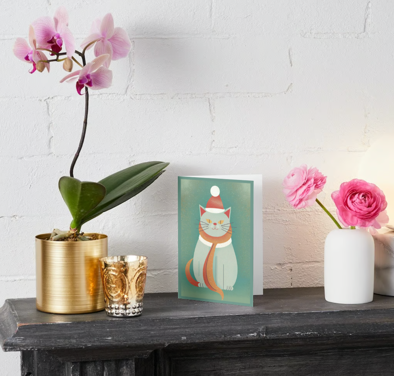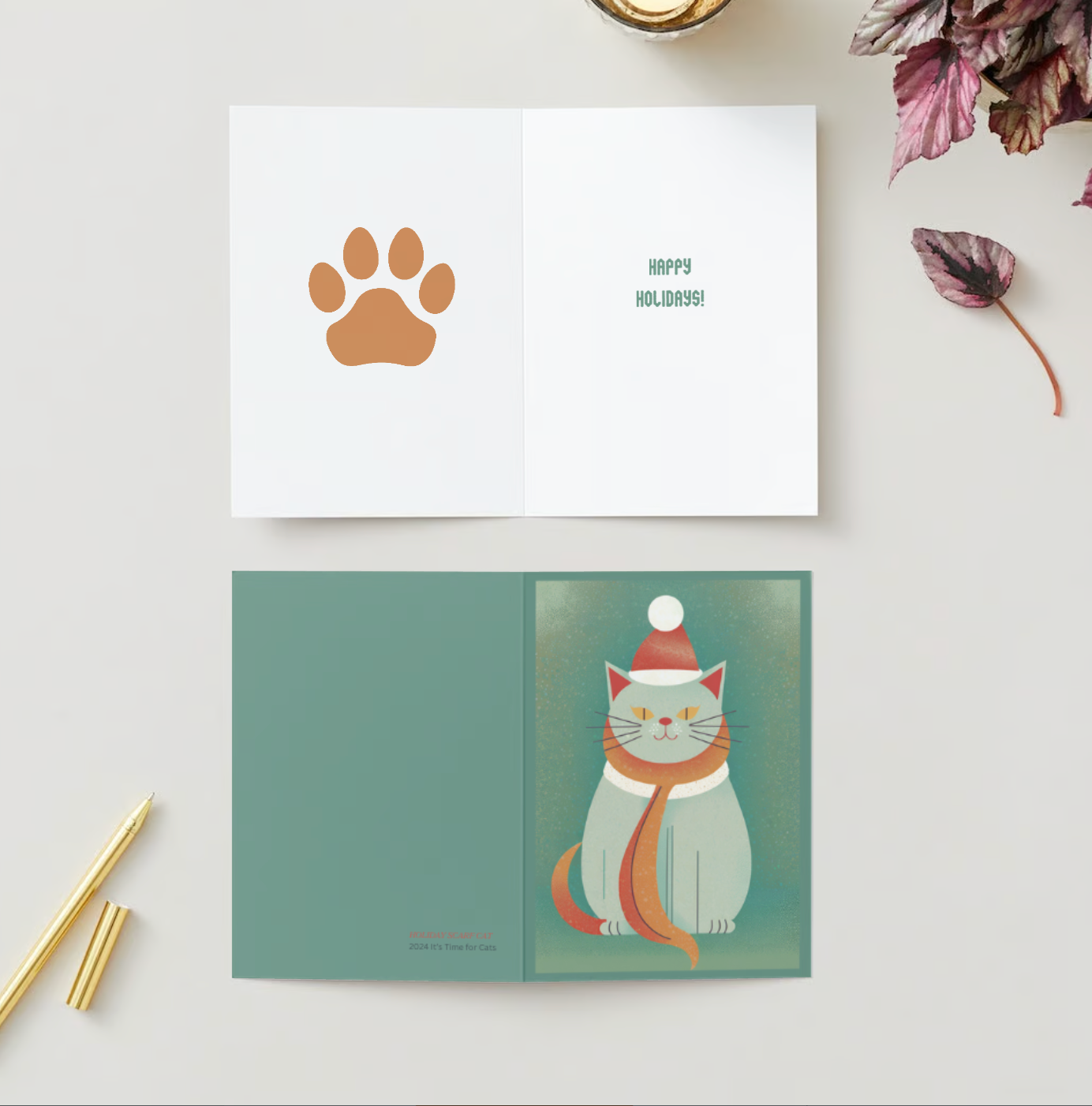 Spread some holiday cheer with our delightful Christmas card featuring an adorable fat cat in a Santa hat and dual colored winter scarf, ready to add warmth and whimsy to your festive greetings! Stylish and unique. Designed by cat people for cat people! Interior reads "HAPPY HOLIDAYS!" and has a large paw print on the opposite interior side. The interior has plenty write your own purr-fect personal holiday message too. Cards measure 5x7 with a vertical fold.