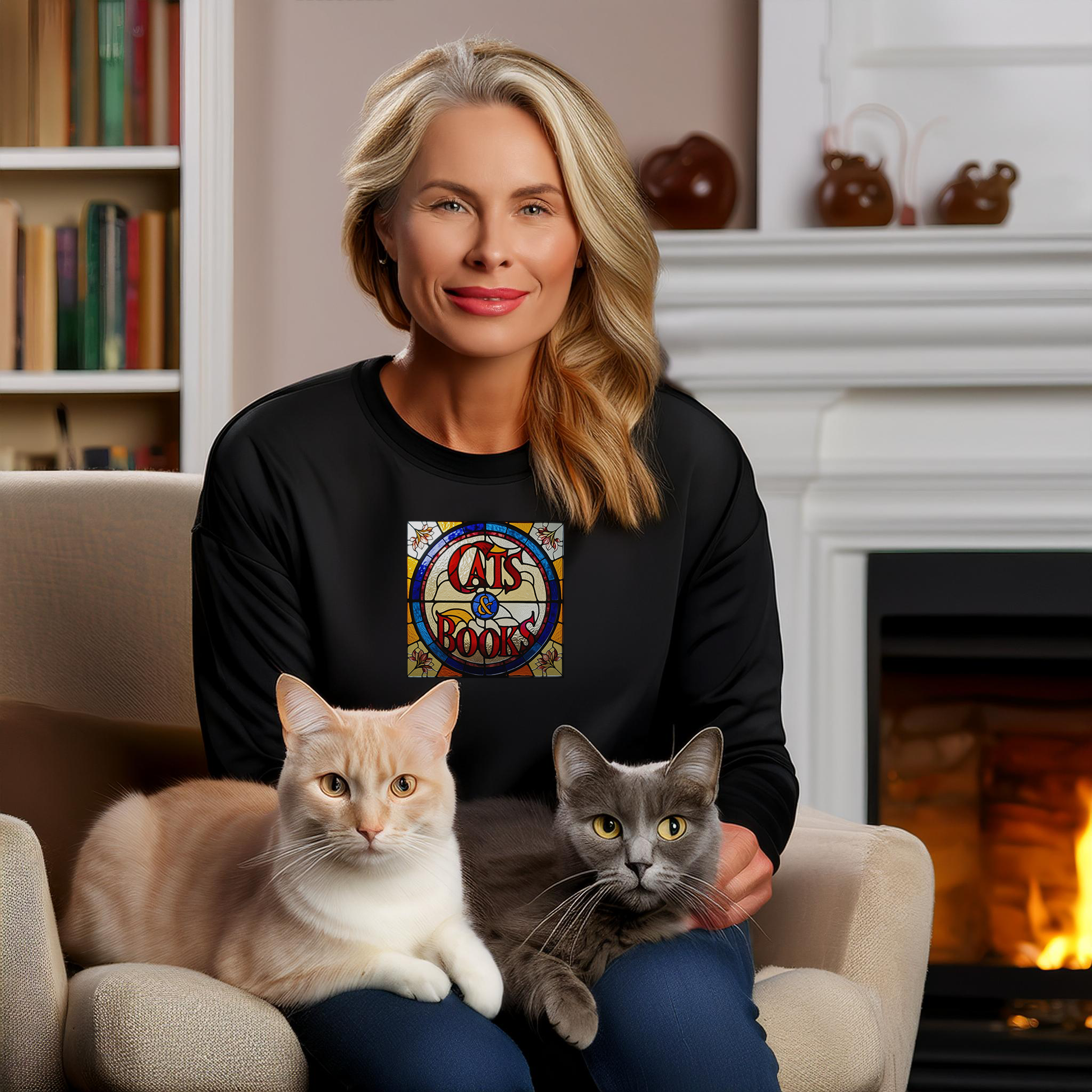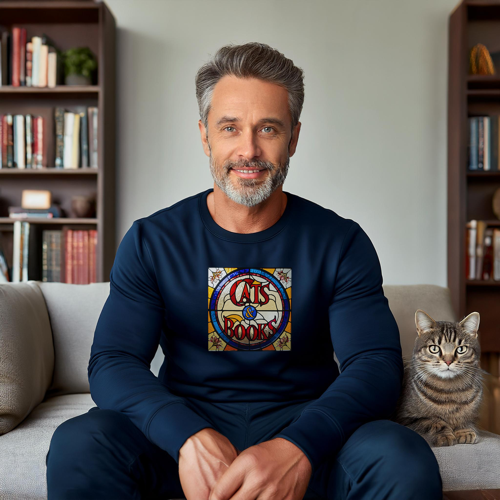 Our favorite things in the world are cats and books. What else does one need? This unisex sweatshirt features a vintage style design inspired by stained glass windows, and is available in navy or black and comes in inclusive sizing. Purrfect for gift giving to the feline and bibliophiles in your life.