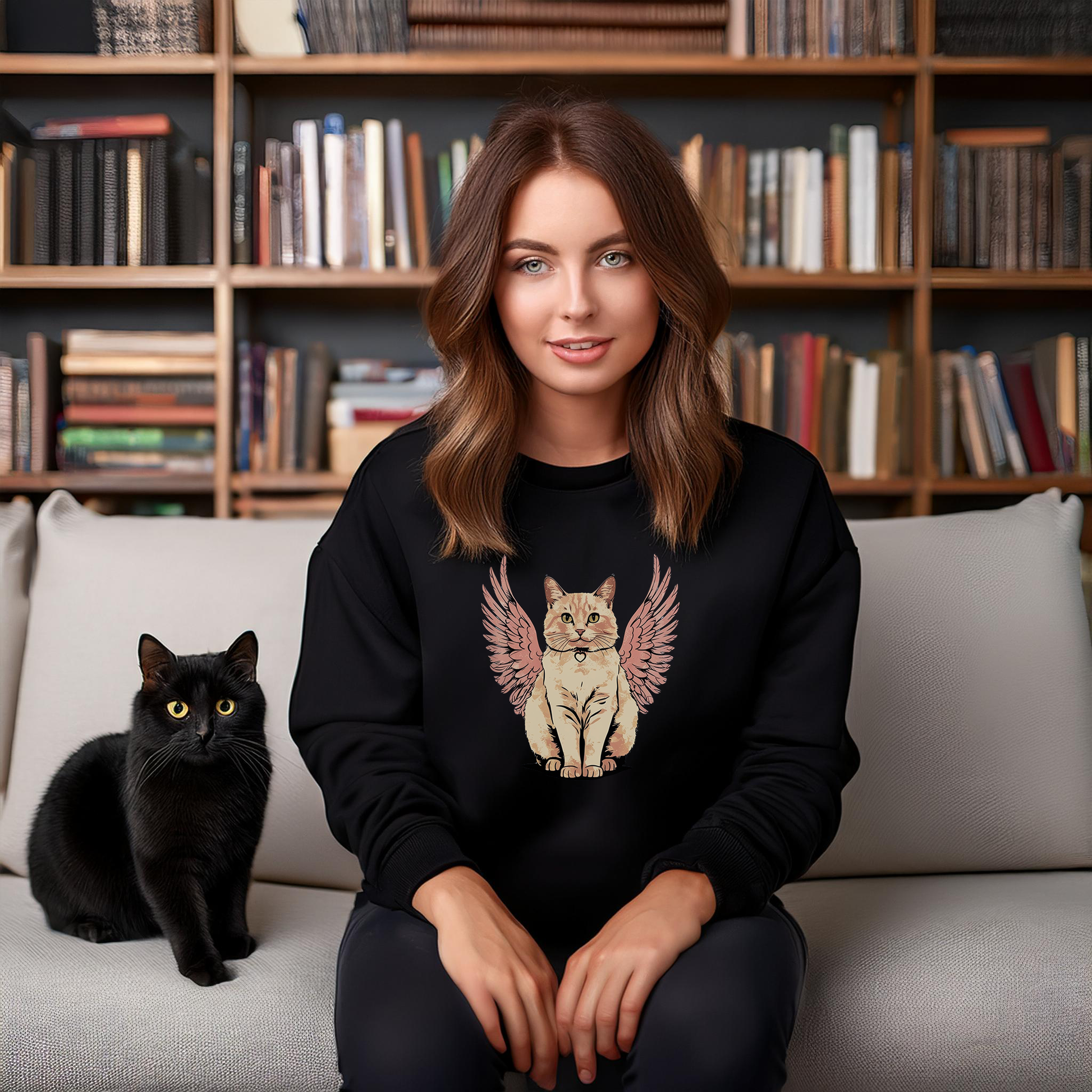 Embrace the whimsical charm of our sweet and cozy Cozy Angel Cat Wings & Heart Sweatshirt, a delightful addition to your wardrobe that combines comfort with playful design. Featuring an adorable cat with wings and a heart on its collar, this sweatshirt is perfect for cat lovers and anyone looking to express their unique style.
