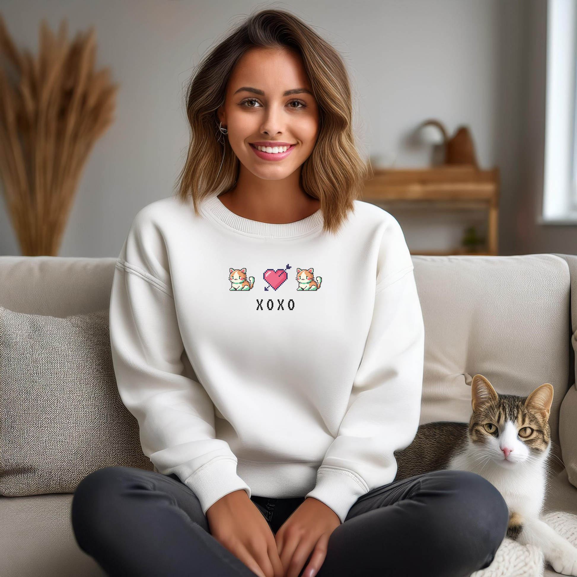 Show off your playful side with our Pixilated Kittens & Heart Crewneck Sweatshirt! Featuring adorable pixel art kittens and a charming 'XoXo' design and heart, this sweatshirt is perfect for cat lovers and gamers alike. Available in four vibrant colors, it's designed for ultimate comfort with a soft blend of cotton and polyester. Whether you're snuggling up at home or out with friends, this classic fit sweatshirt adds a touch of whimsy to any outfit. Lovely gift for Valentine's Day or to show your love for cats all year round.
