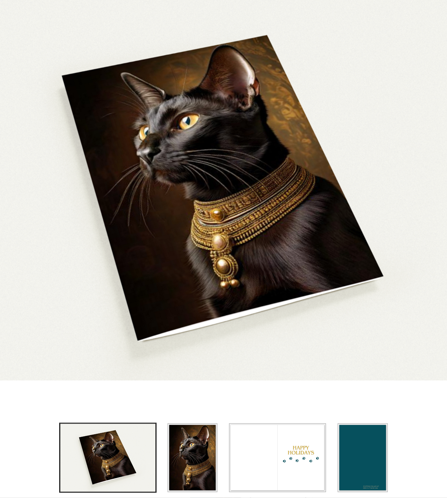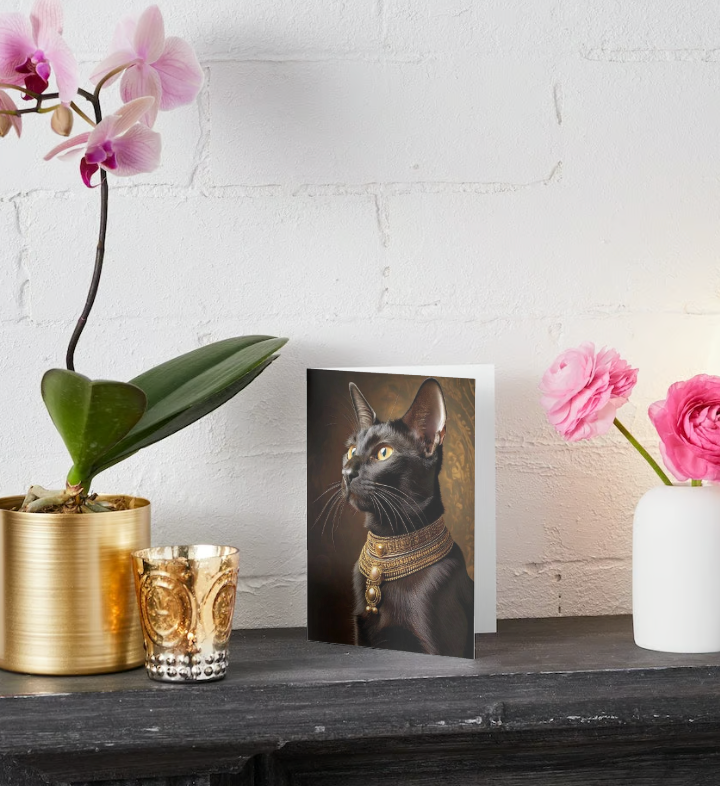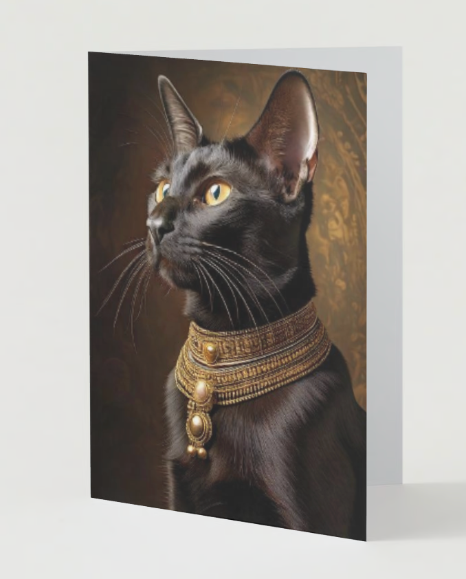 Spread some Egyptian style holiday cheer with our delightful Christmas card featuring an regal black cat in a fancy collar, ready to add warmth and whimsy to your festive greetings! Stylish and unique. Designed by cat people for cat people! Inside reads "HAPPY HOLIDAYS" and has little paw prints below the text. There's also plenty of room to write your own purr-fect personal holiday message too. Cards measure 5x7 with a vertical fold.
