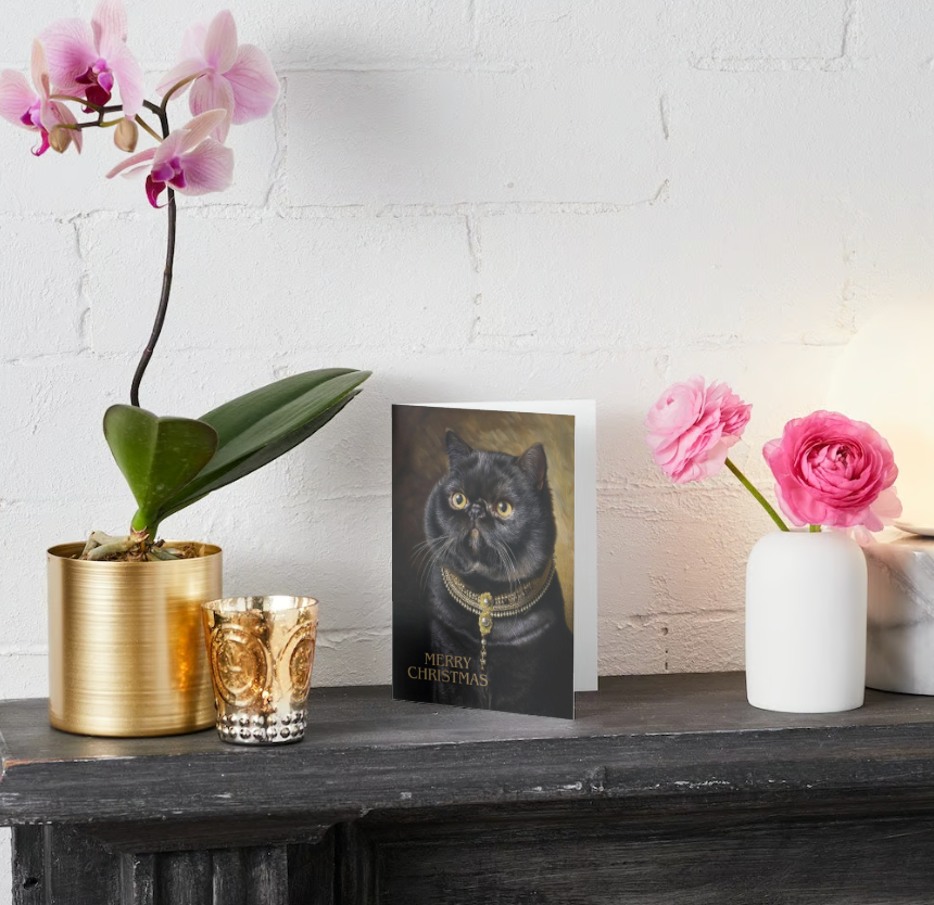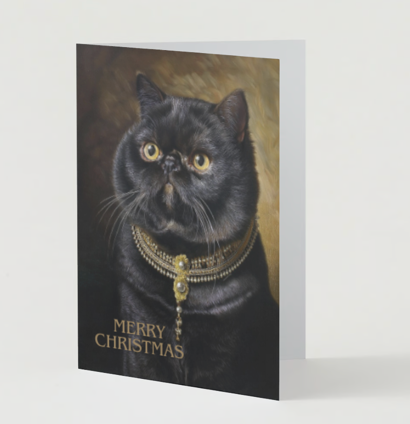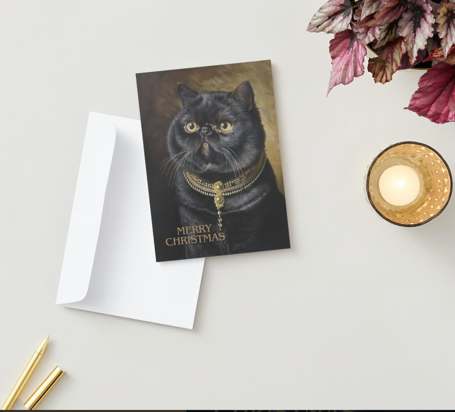 Spread some Baroque style holiday cheer with our delightful Christmas card featuring an adorable black Exotic Shorthair breed cat in a fancy collar, ready to add warmth and whimsy to your festive greetings! Stylish and unique. Designed by cat people for cat people! Front reads "MERRY CHRISTMAS" and the interior is blank to write your own personal purrfect holiday message.