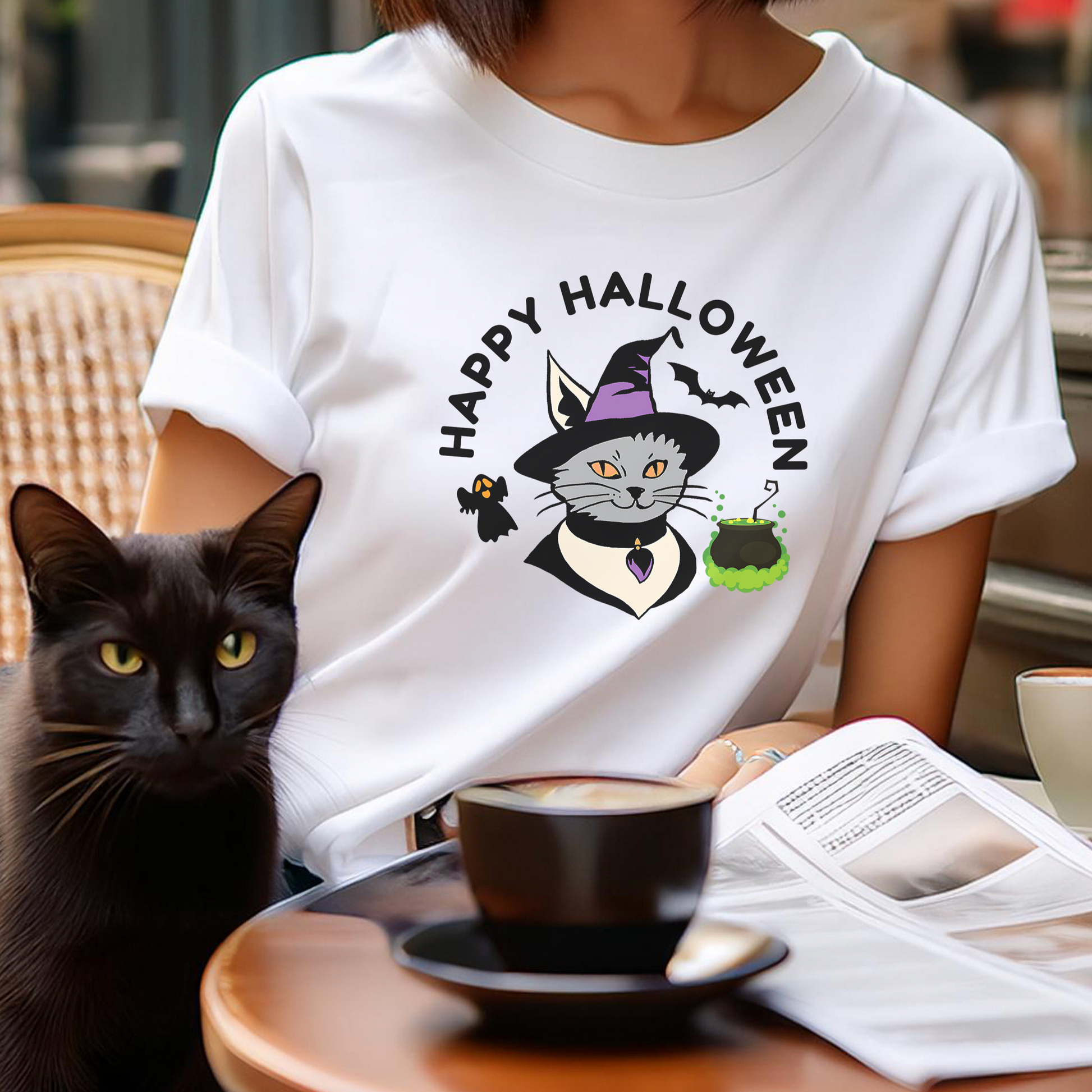 HAPPY HALLOWEEN WITCH CAT CAULDRON (Premium Unisex Crewneck T-Shirt)