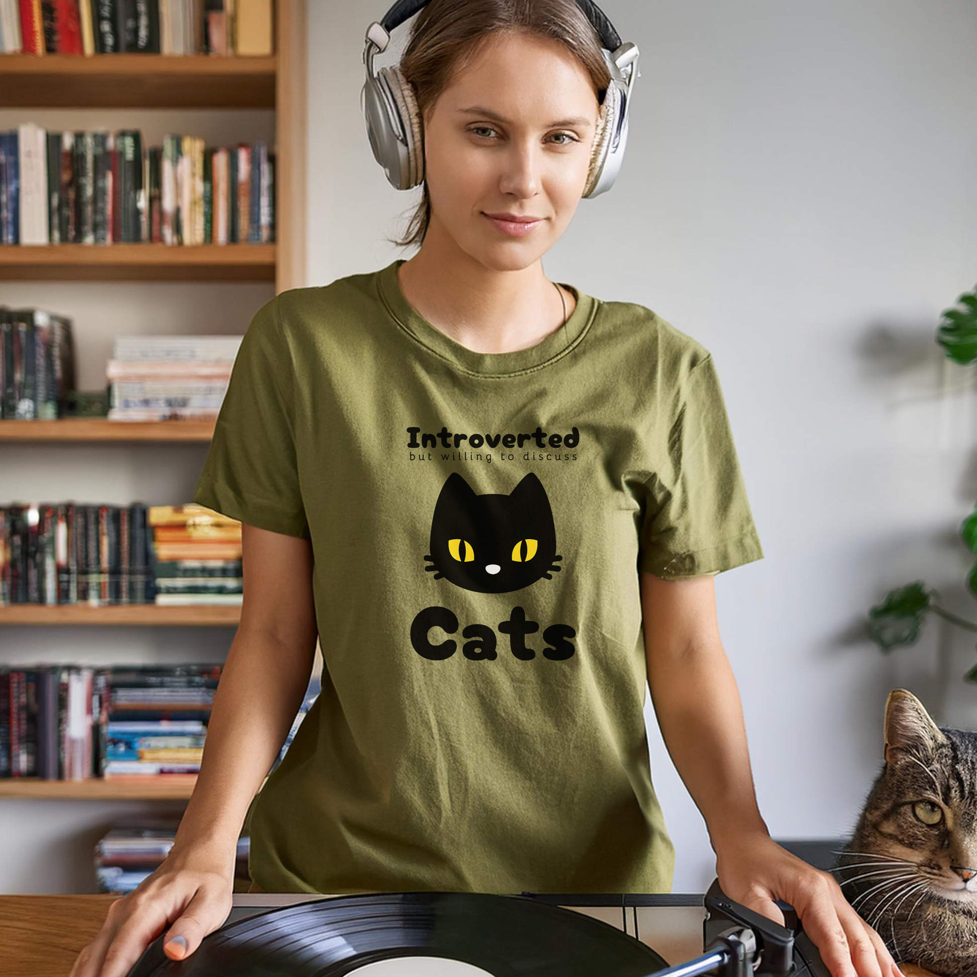 Are you introverted, but willing to talk about cats? Same. This playful tee is available in 4 subtle colors. A nice gift for cat owners.
