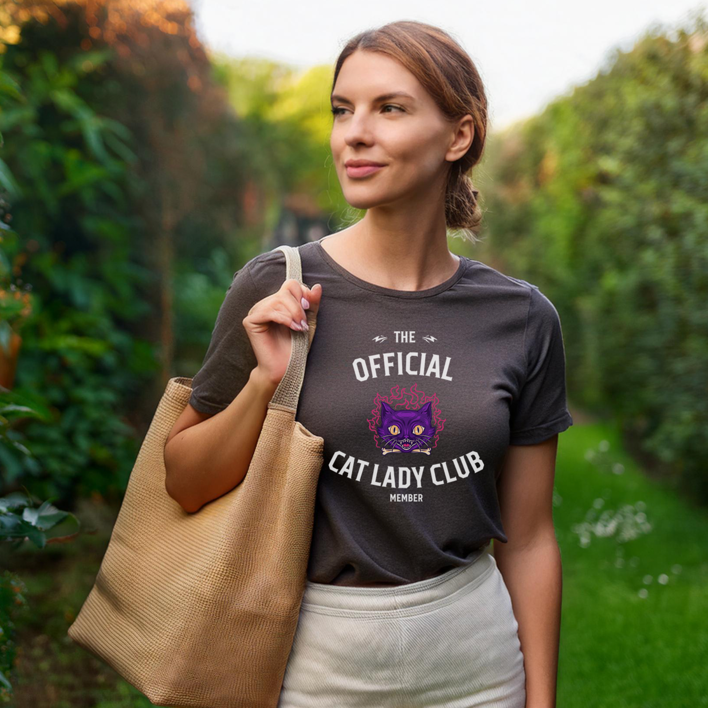 Join the club! We all know a cat lady or cat gent. First rule of Cat Lady Club is that you DO talk about Cat Lady Club. Printed in punky purple, pink and white on a solid black or heather grey tee. This unisex t-shirt is renowned for its soft feel and sturdy construction.