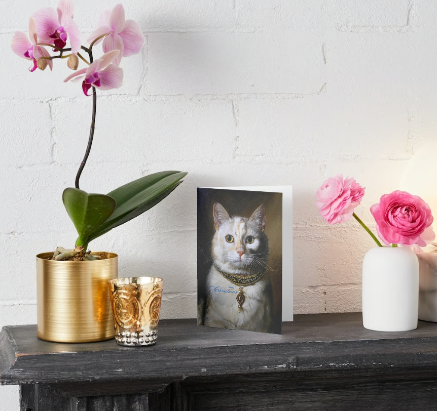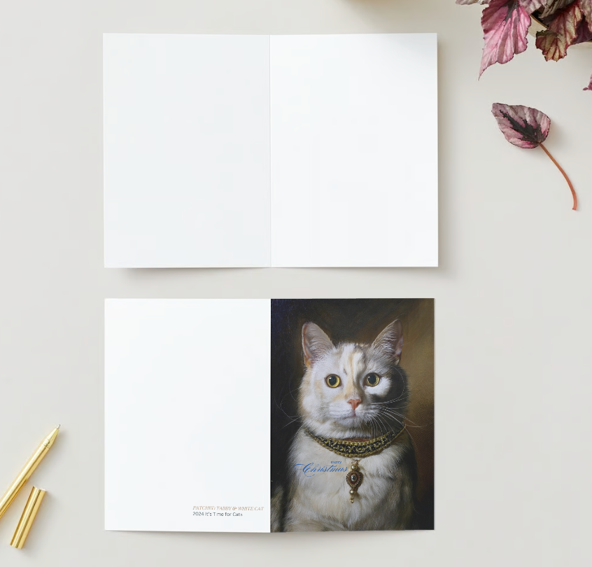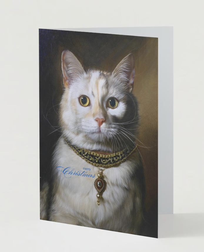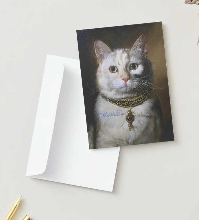 Spread some Baroque style holiday cheer with our delightful Christmas card featuring an adorable patched tabby and white Domestic Shorthair cat in a fancy collar, ready to add warmth and whimsy to your festive greetings! Stylish and unique. Designed by cat people for cat people! Front reads "merry Christmas" in blue font and the interior is blank to write your own purr-fect personal holiday message. Cards measure 5x7 with a vertical fold.