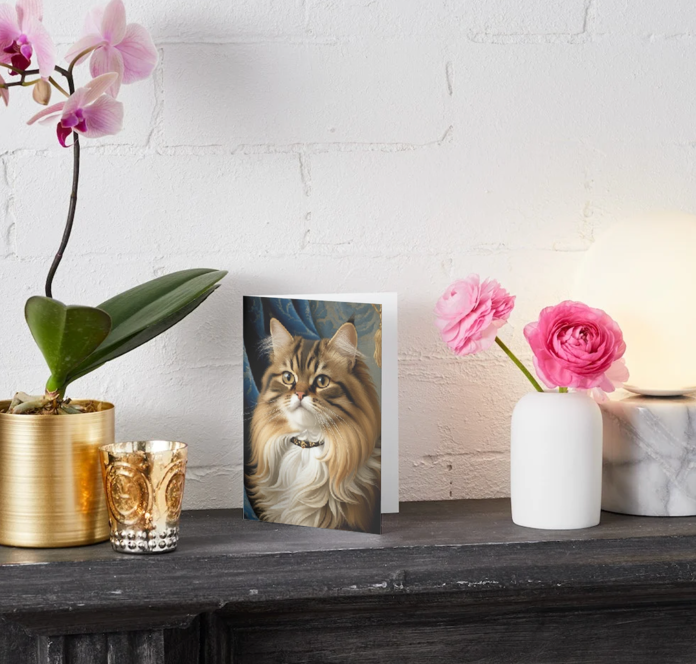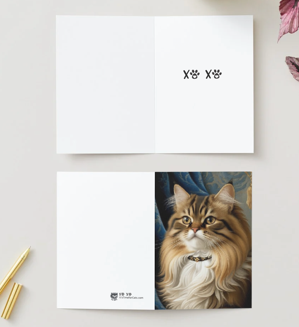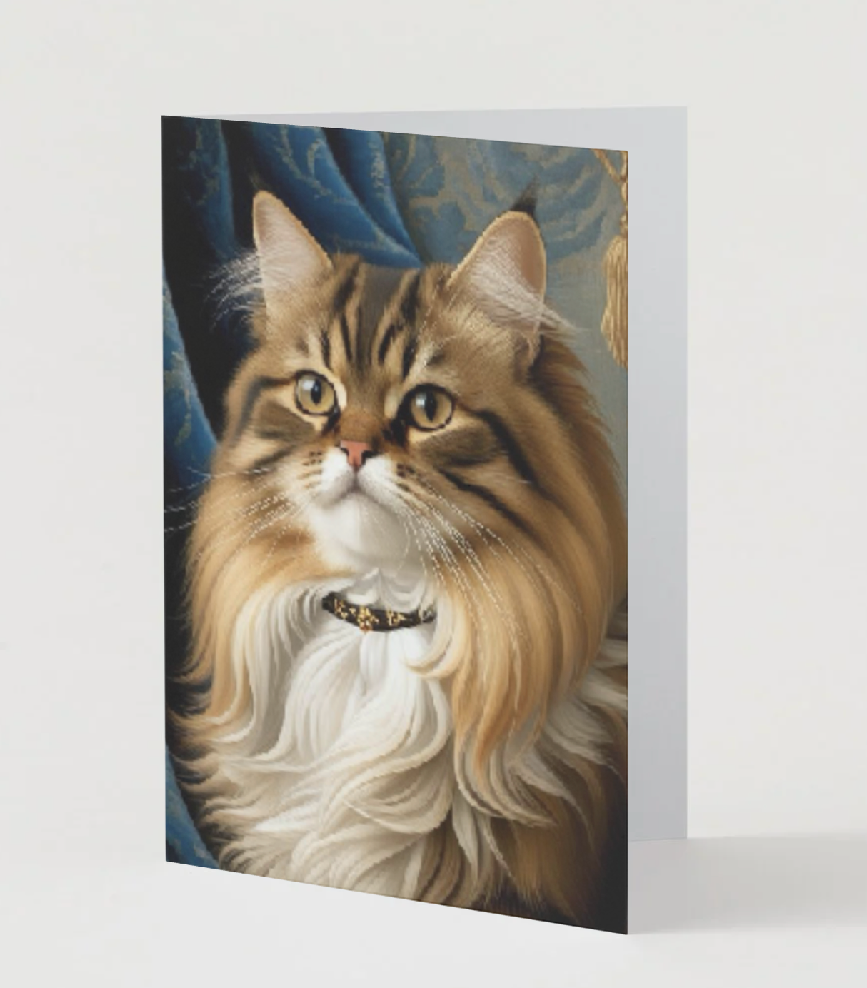 Create a one-of-a-kind sentiment with our Portrait Tabby Cat Greeting Cards, featuring an exquisite design of a pretty longhaired tabby cat adorned with a fancy collar. Perfect for conveying heartfelt messages on any occasion. These customizable luxury greeting cards are purrfect for many occasions.