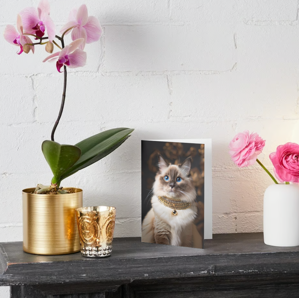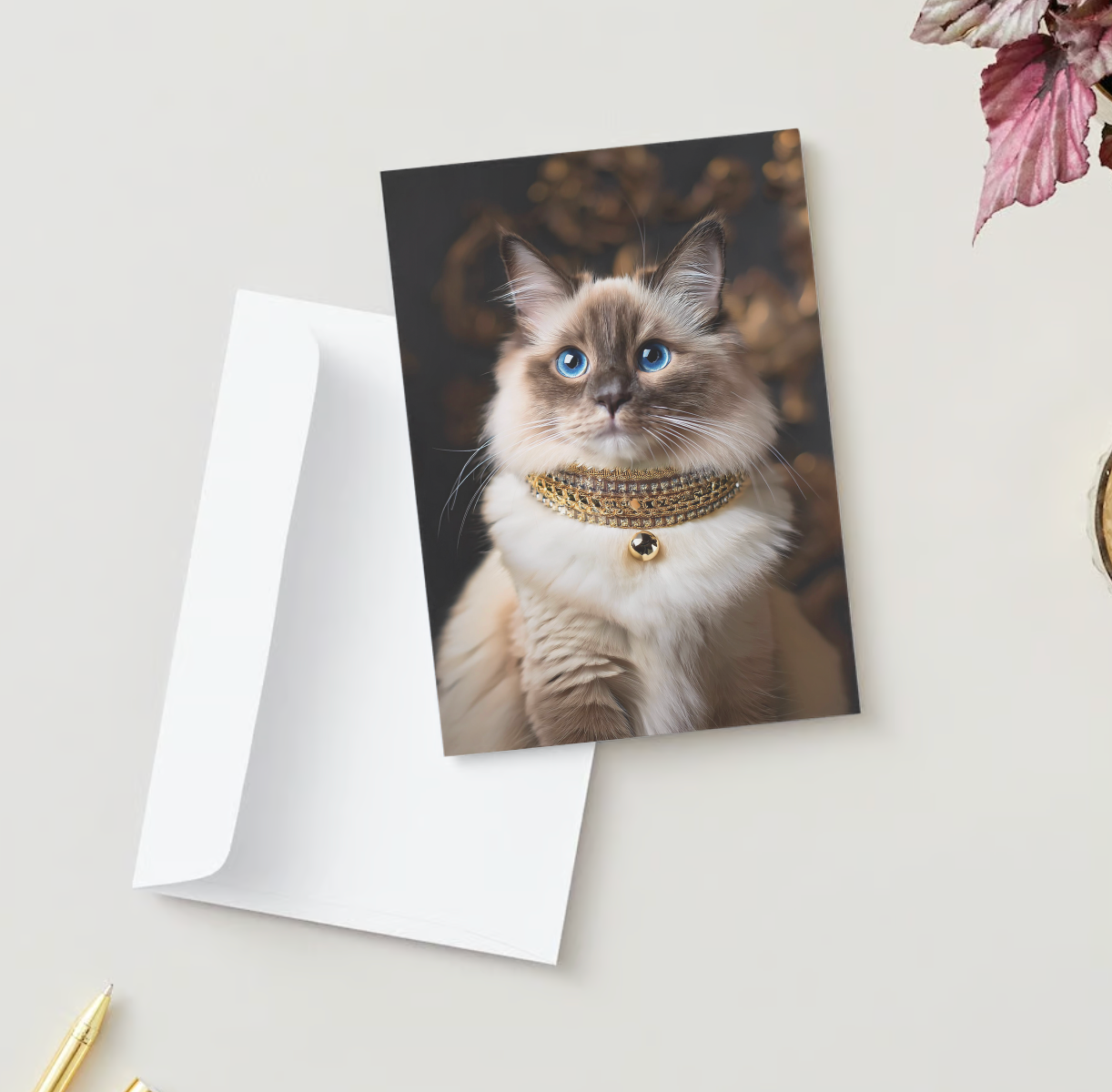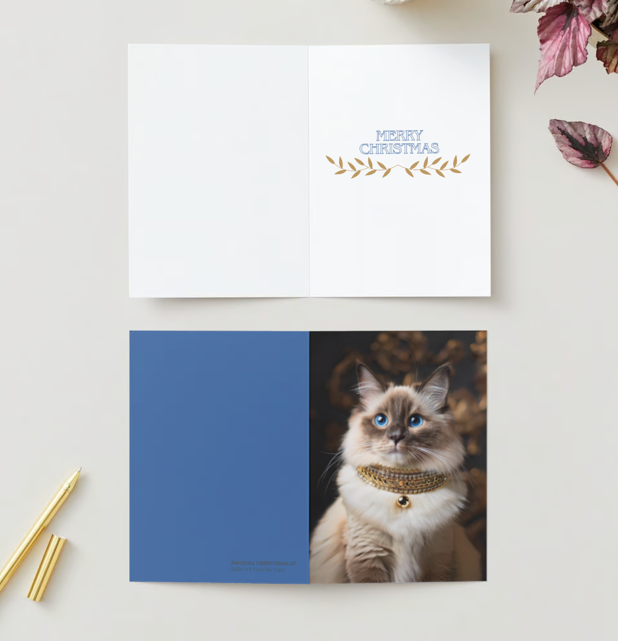 Spread some fancy feline fashion holiday cheer with our delightful cat-centric Christmas card featuring an adorable Ragdoll breed cat in a golden collar with bell, ready to ring in your festive greetings! Stylish and unique holiday cards. Designed by cat people for cat people! Inside reads "MERRY CHRISTMAS" and has a small leaf garland below it. The interior has plenty space write your own purr-fect personal holiday message too. Cards measure 5x7 with a vertical fold.