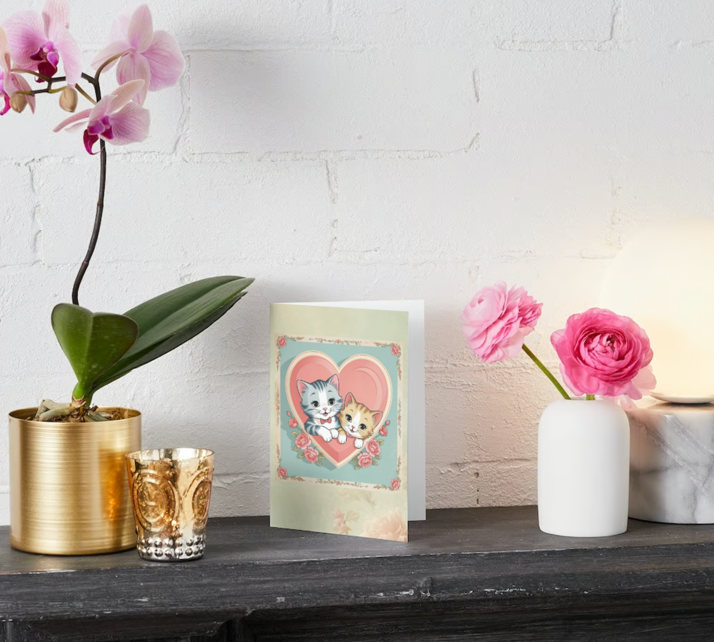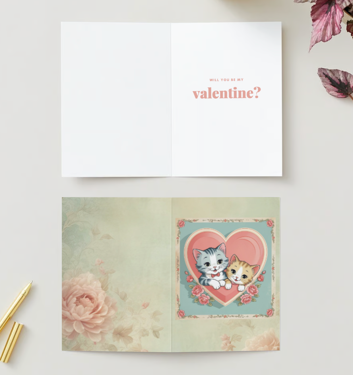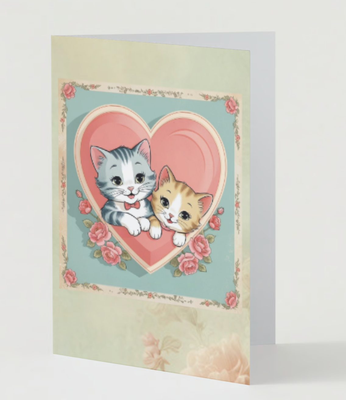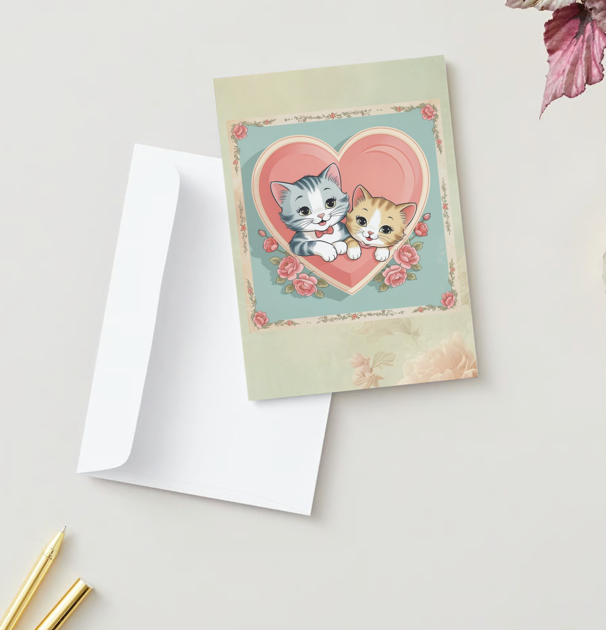 Celebrate love with a vintage nostalgic twist using our Retro Kittens Greeting Cards. This delightful pack of 10 features two charming kittens nestled inside a large heart with a delicate floral border and background, reminiscent of vintage Valentine’s Day designs. Perfect for expressing sentiments on Valentine's Day, these cards are a whimsical way to show you care. Crafted from high-quality, eco-friendly paper. Add a touch of nostalgia to your greetings and spread joy! Order your pack today and bring a smile to someone special’s face.