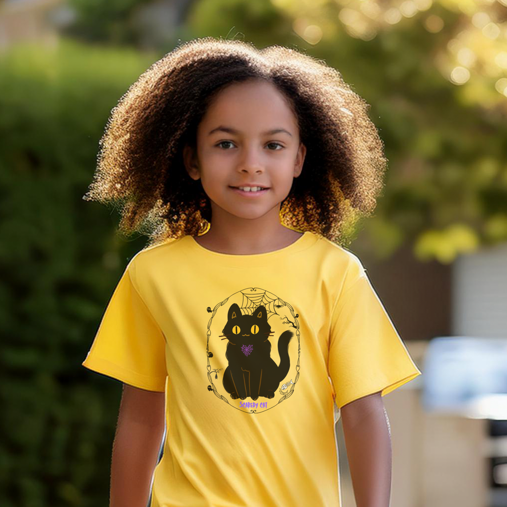 Elevate your toddler child's Halloween wardrobe with our Scaredy Cat t-shirt. Featuring a wide-eyed black kitty framed by not-so-spooky mini critters - a spider, bats, and ghosts. Available in white or yellow color ways.