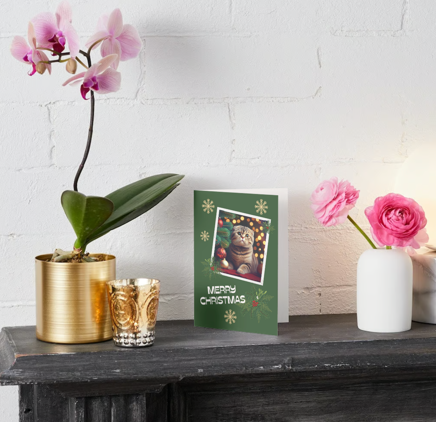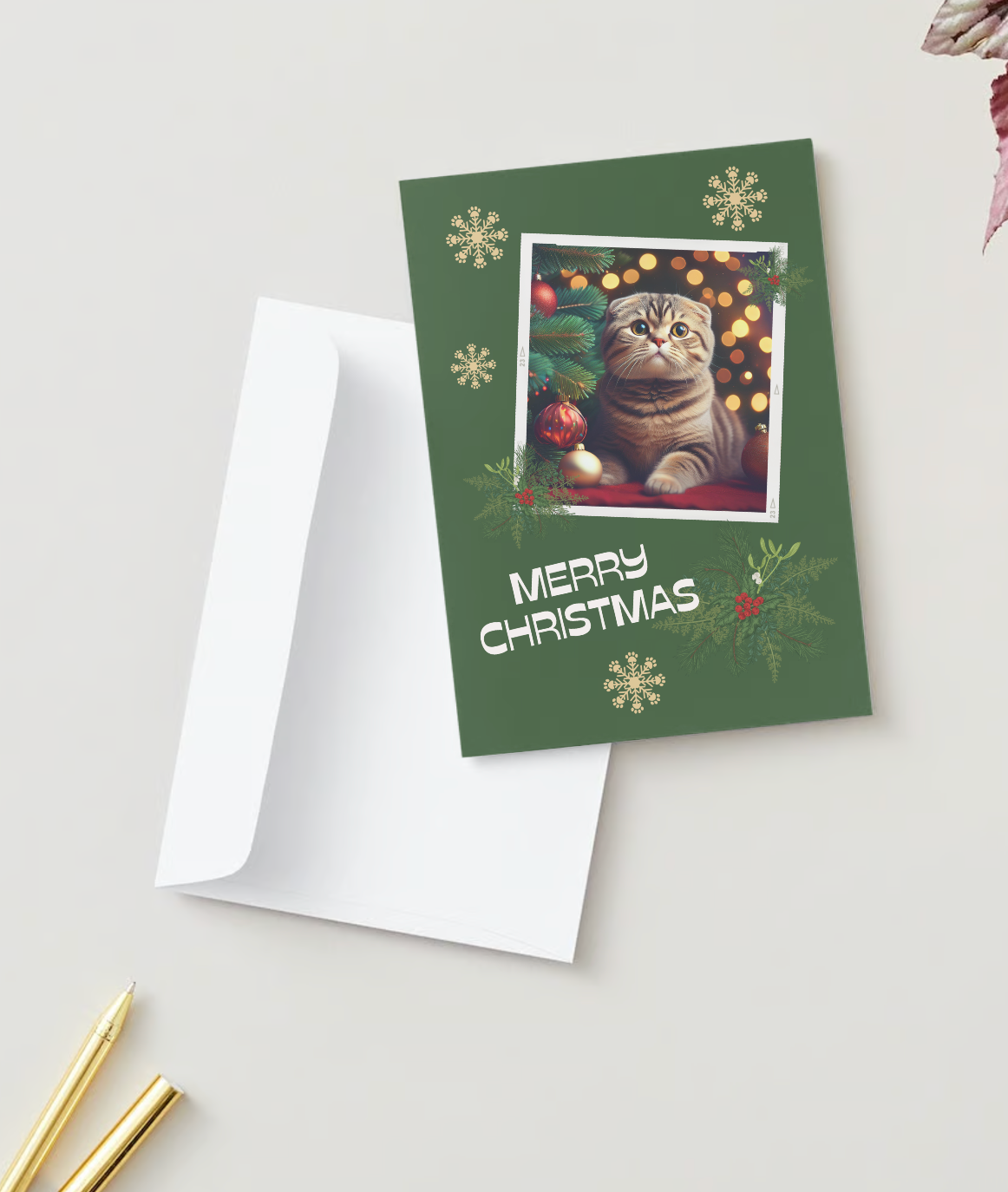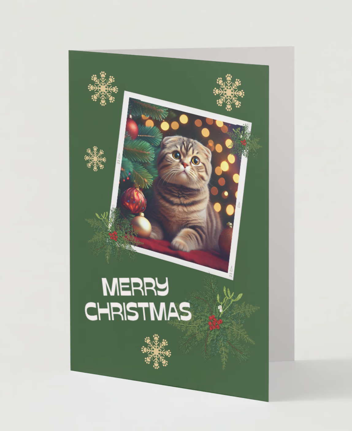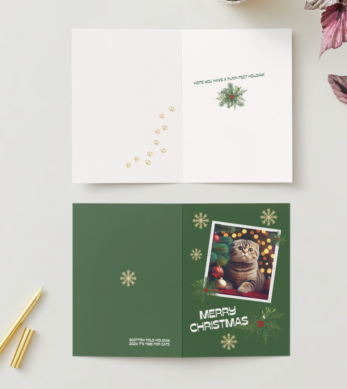 Capture the spirit of the season with our delightful Scottish Fold Cat Holiday Greeting Cards. Each festive holiday card card features an adorable polaroid image of a charming Scottish Fold cat nestled under a twinkling tree, adorned with sparkling lights, against a lush green backdrop sprinkled with snowflakes and greenery. Perfect for sending warm wishes and a Merry Christmas to loved ones, these cards are made with premium eco-friendly paper with a coated silk finish. Share the joy this holiday season and order your pack of 10 cards today!