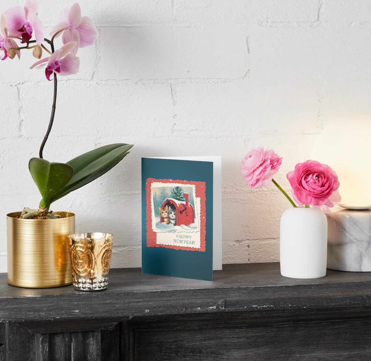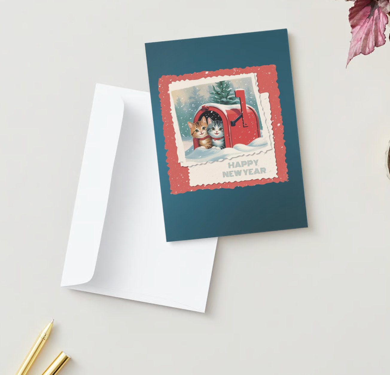 Send warm wishes this holiday season with our Vintage Kittens in Snowy Mailbox Greeting Cards. These charming cards capture the whimsical scene of two adorable kittens peeking from a mailbox blanketed in snow. Perfect for sending love and cheer, these cards are designed to make every recipient smile. Each pack includes 10 high-quality cards and envelopes crafted from eco-friendly paper. Ideal for holiday greetings, heartfelt notes, or as a unique gift for cat lovers. Make your season even brighter – order your pack today, and spread joy with every card! Exterior reads "HAPPY NEW YEAR" and the interior has cat paw prints.