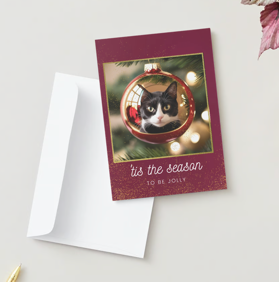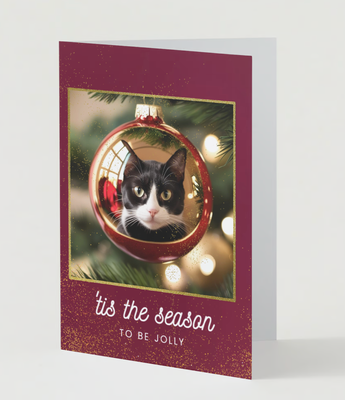 Celebrate the festive season with our captivating Tuxedo Cat Christmas Card. The design is from an ornament's point of view! Featuring a stunning close-up of a tuxedo cat's face beautifully reflected in a shiny Christmas ornament, this card adds a unique touch to your holiday greetings. Perfect for sending warm wishes to friends and family or as a delightful gift for cat lovers. Each card in this pack of 10 is printed on premium quality, eco-friendly paper for a luxurious feel. Make your holiday outreach distinctive and heartwarming by purchasing this beautiful card pack today!