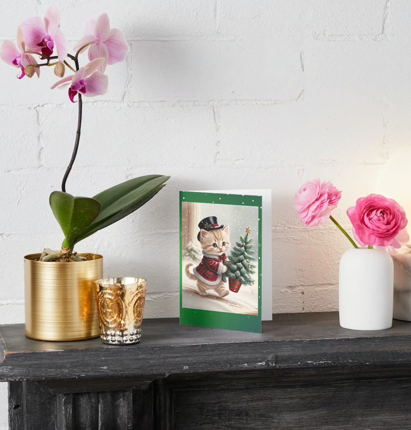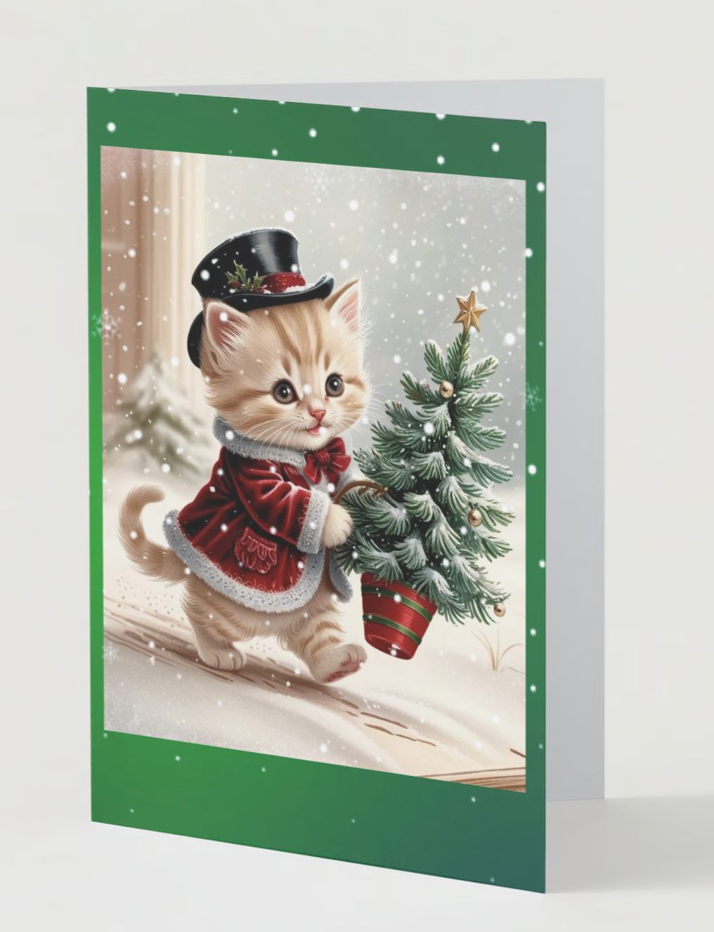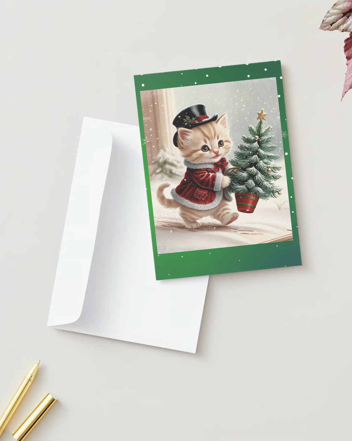 Send warm wishes this holiday season with our charming Pack of 10 Holiday Greeting Cards featuring an adorable orange tabby kitten in a Victorian coat, carrying a Christmas tree through the snow. Perfect for spreading joy and cheer during Christmas, these cards are designed to make your loved ones smile. Printed on high-quality, eco-friendly paper, they provide a personal touch to your heartfelt messages. Whether for family, friends, or colleagues, these unique cards are a delightful way to share the spirit of the season. Order your pack today and start spreading holiday magic!