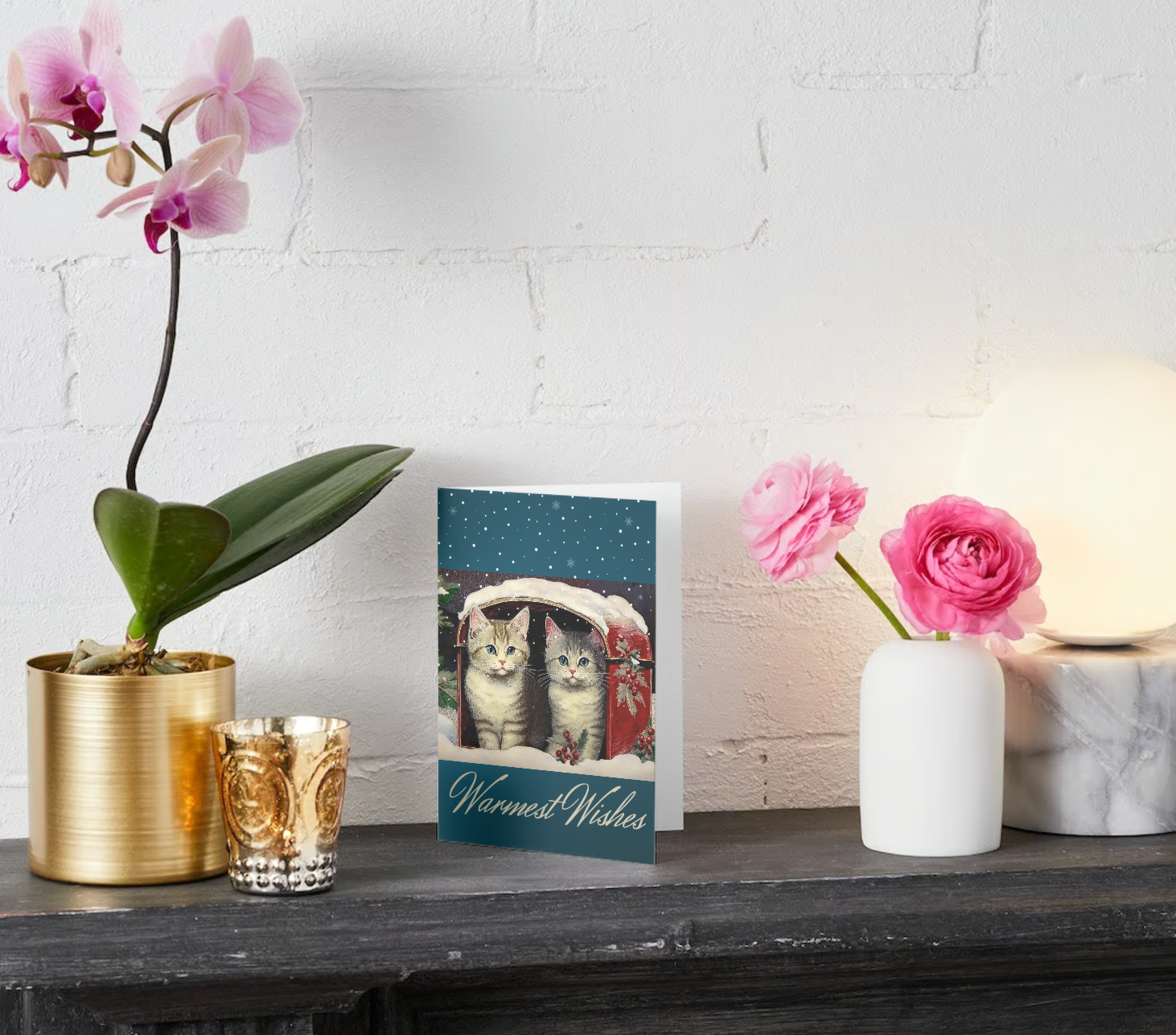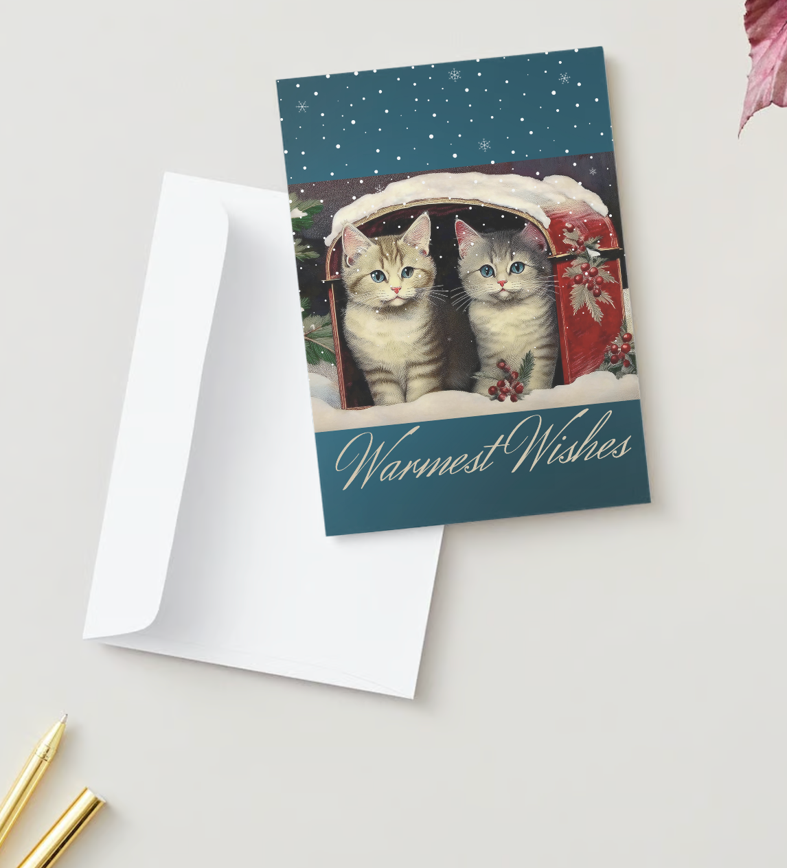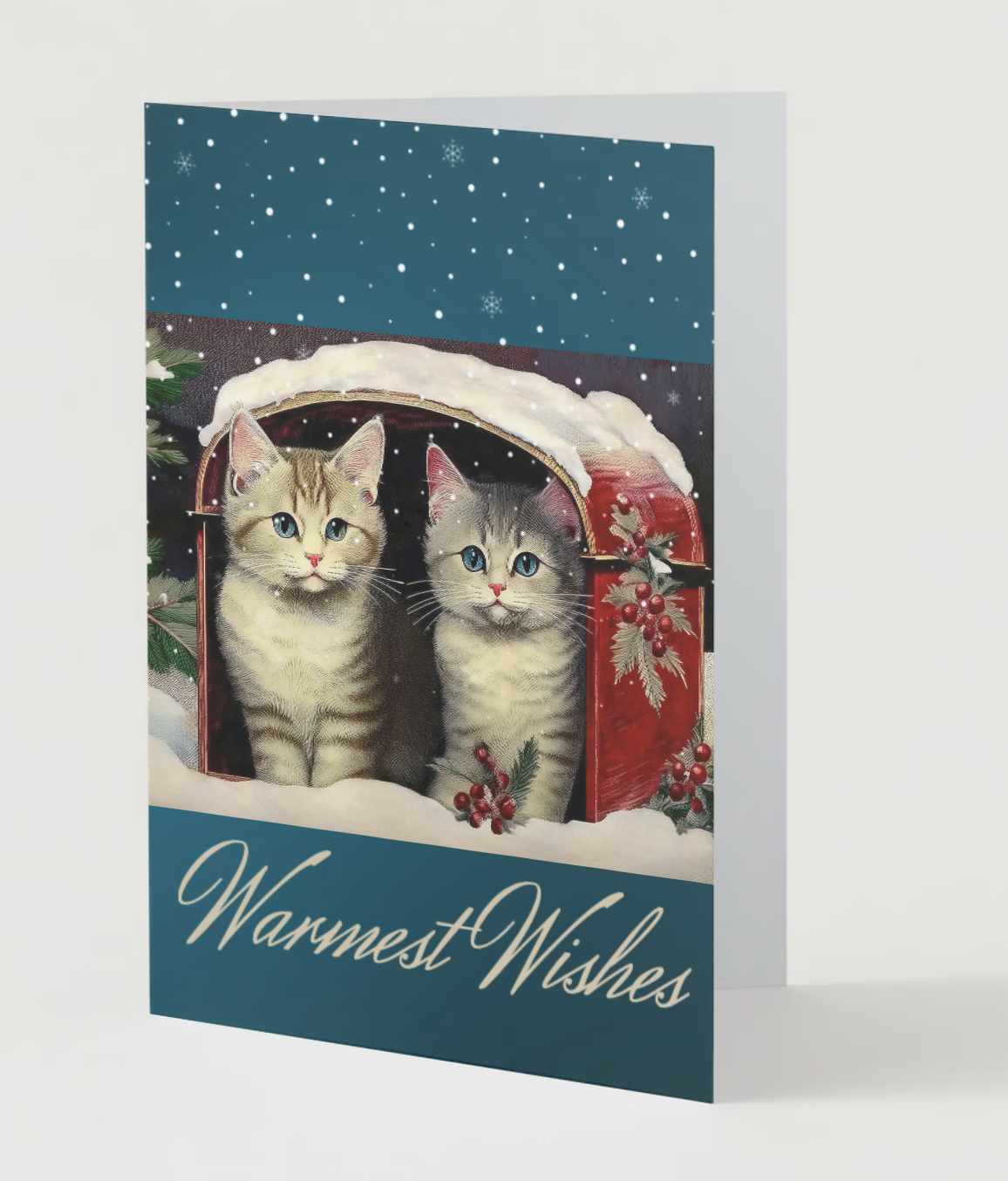 Send love wrapped in nostalgia with our Vintage Kittens in Mailbox Greeting Cards. Perfect for the holiday season, these cards capture the charm of 1950s vintage cat illustrations featuring two adorable kittens nestled in a mailbox amid a picturesque snowy scene. Great for spreading joy during Christmas, birthdays, or just because! Made from high-quality, eco-friendly paper, these cards feel as wonderful as they look. Bring warmth and whimsy to your greetings—order your pack of 10 today!