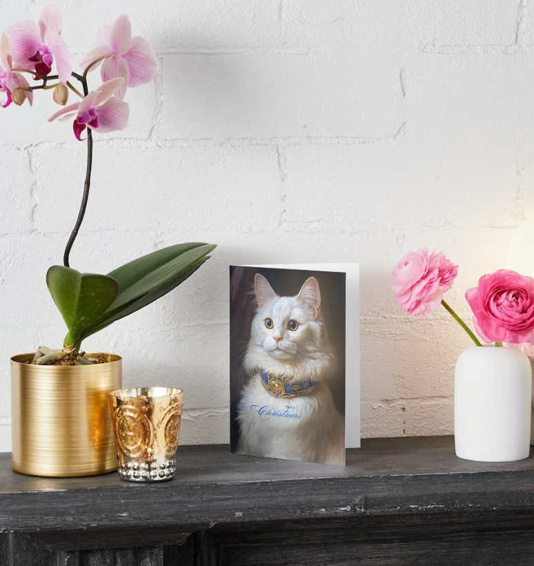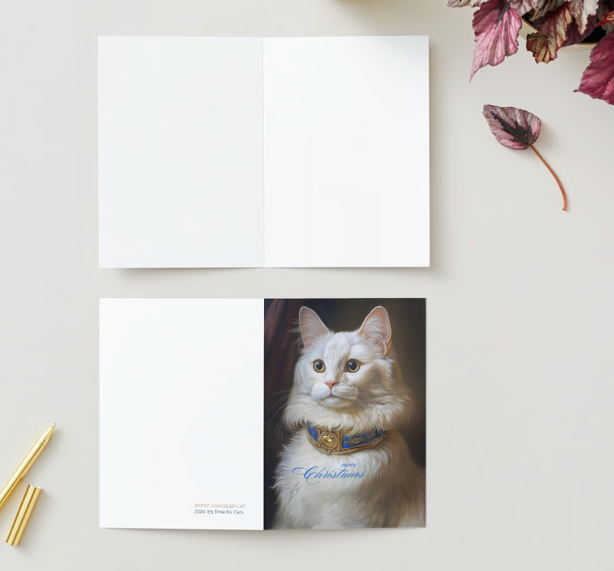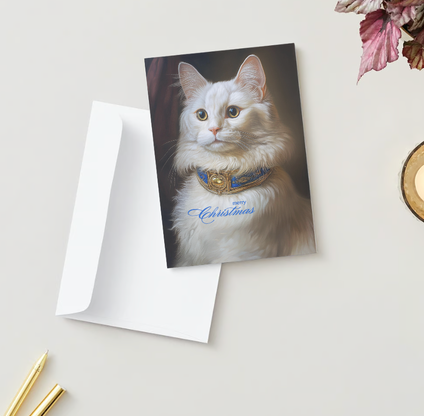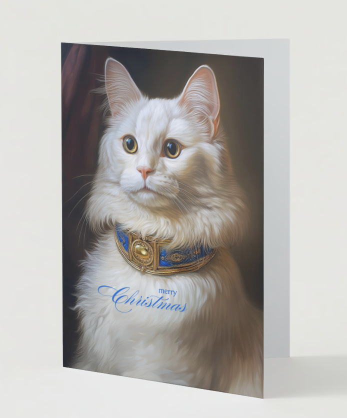 Spread some Baroque style holiday cheer with our delightful Christmas card featuring an adorable gold eyed white Domestic Longhair cat in a fancy collar, ready to add warmth and whimsy to your festive greetings! Stylish and unique. Designed by cat people for cat people! Front reads "merry Christmas" and the interior is blank to write your own purr-fect personal holiday message. Cards measure 5x7 with a vertical fold.